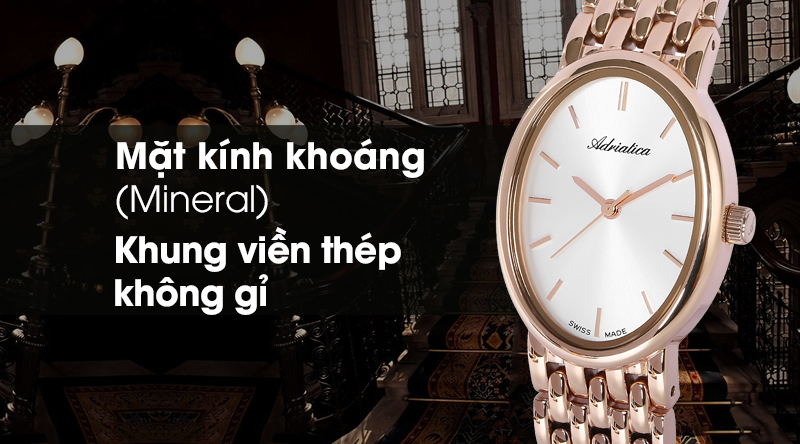 - Mẫu đồng hồ Adriatica nữ có khung viền bền bỉ, kết cấu chắc chắn, chống oxi hóa cao giúp bộ khung luôn sáng bóng.
