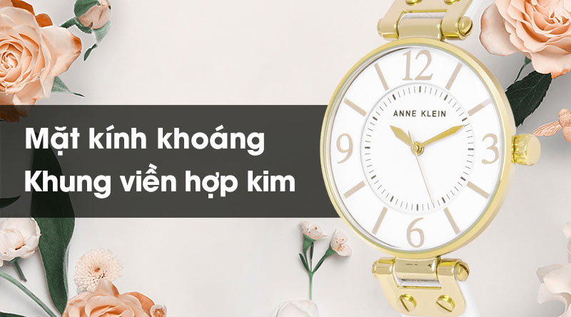 - Mẫu đồng hồ Anne Klein nữ bền bỉ với khung viền thon gọn, sáng bóng, chịu được các va đập thông thường.