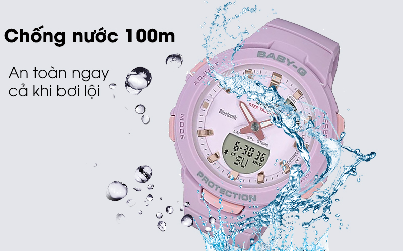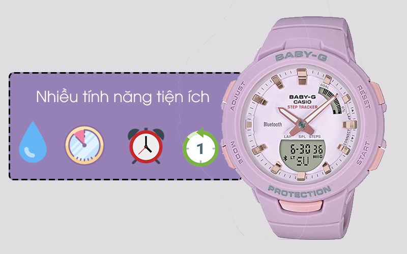 Không chỉ đẹp về thiết kế, hài hòa về màu sắc mà chiếc đồng hồ Baby-G này còn nổi bật với những tính năng vượt trội so với những chiếc đồng hồ thông thường như kết nối bluetooth, đèn nền, báo thức, bấm giờ đếm ngược, bấm giờ thể thao.