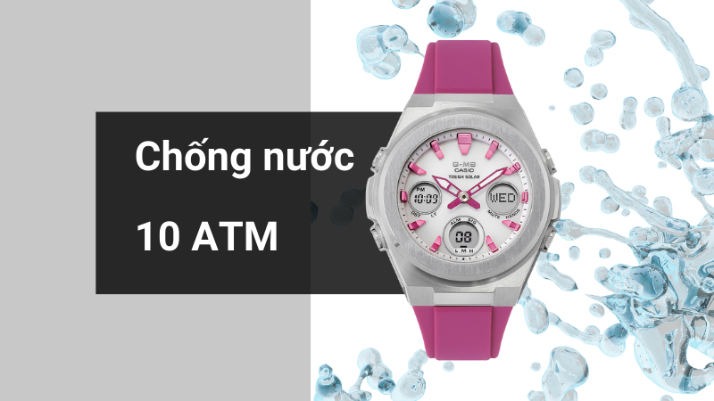 • 10 ATM là hệ số chống nước của mẫu đồng hồ này, đeo được khi tắm, bơi mà không lo đồng hồ bị vào nước. Lưu ý: Không bấm các nút điều khiển khi bơi, không mang khi lặn.