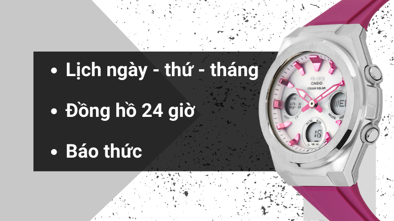 • Chiếc đồng hồ Baby-G này có các tiện ích như: báo thức, bấm giờ thể thao, bấm giờ đếm ngược, giờ thế giới, lịch ngày, thứ, lịch tháng, âm bàn phím, đồng hồ 24 giờ. Đặc biệt đồng hồ có đèn tự động khi nâng cổ tay góc 40 độ. Yên tâm xem giờ trong bóng tối vì đã có kim dạ quang.