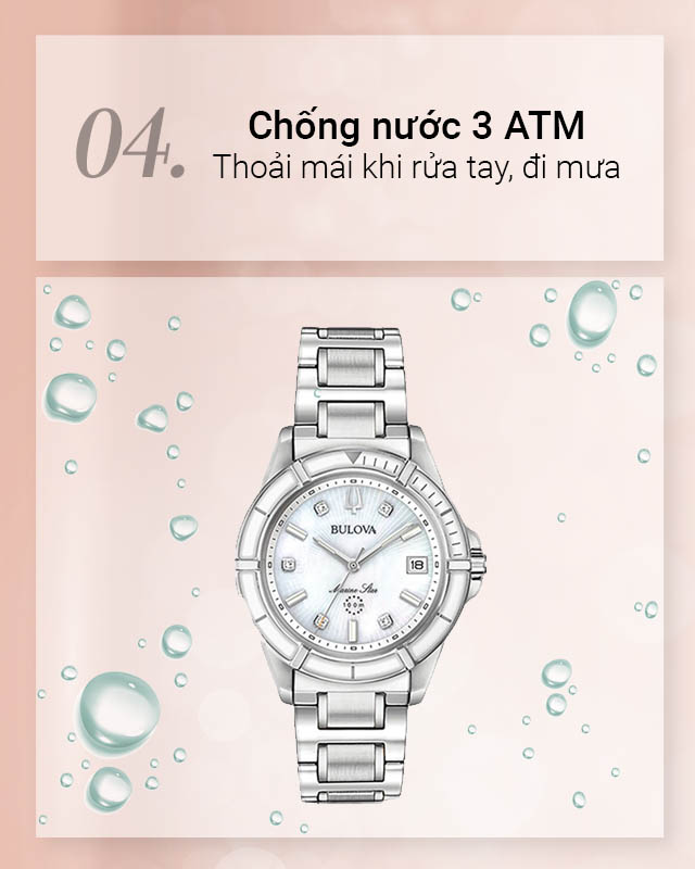 - Hệ số chống nước của đồng hồ là 3 ATM nên có thể an tâm mang theo khi rửa tay, đi mưa nhỏ nhưng không nên đeo khi đi tắm hoặc bơi, lặn