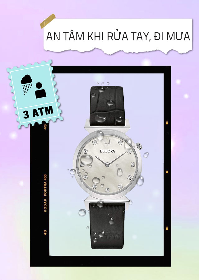 - Hệ số chống nước của đồng hồ nữ là 3 ATM, an tâm sử dụng khi đi mưa và rửa tay. Tuy nhiên, tránh sản phẩm mau hư hại thì không nên mang khi tắm, bơi lội và lặn