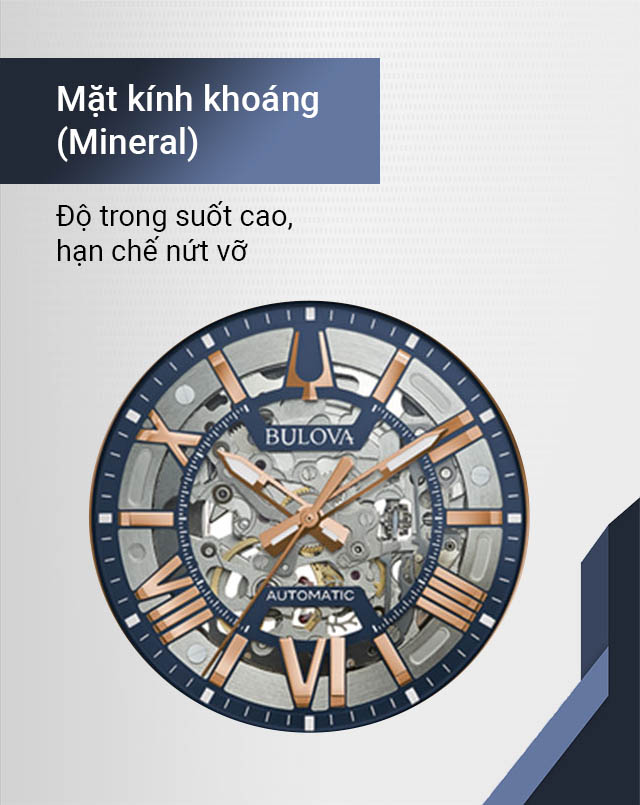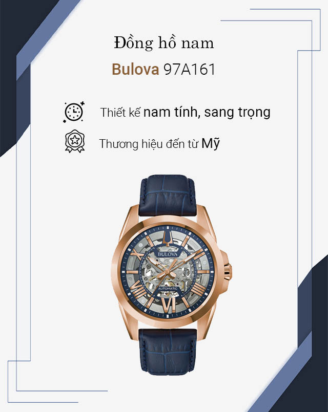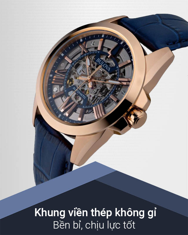 Tổng quan về đồng hồ Nam Bulova 97A161Đồng hồ Nam Bulova 97A161 có mặt kính khoáng trong suốtĐồng hồ Nam Bulova 97A161 có hệ số chống nước 10 ATMĐồng hồ Nam Bulova 97A161 có dây đeo da êm áiĐồng hồ Nam Bulova 97A161 có khung viền thép không gỉĐồng hồ Nam Bulova 97A161 có bộ máy cơ tự động bền bỉ