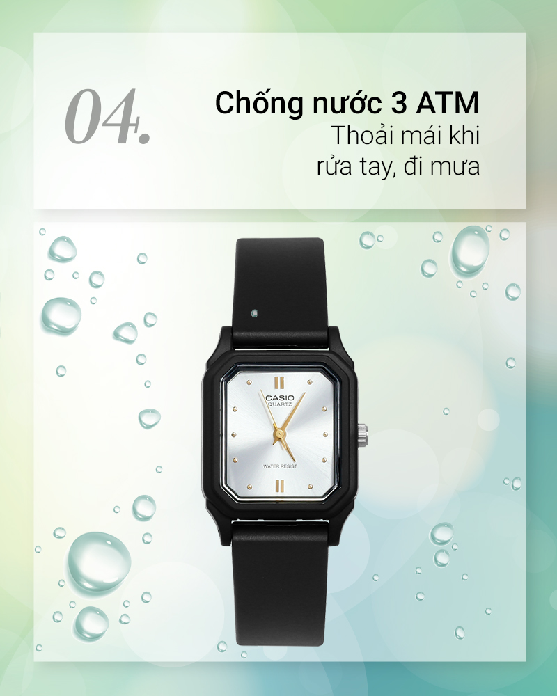 - Chiếc đồng hồ nữ có hệ số chống nước 3 ATM, đeo đi mưa nhỏ và rửa tay đều được, không nên mang khi tắm rửa, bơi lội