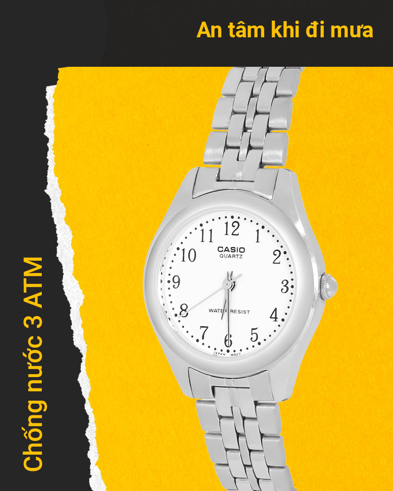 - Hệ số chống nước 3 ATM, đảm bảo cho đồng hồ an toàn khi đi mưa nhỏ và rửa tay, không đeo được khi tắm rửa và bơi lội