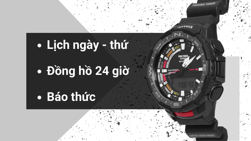 • Đồng hồ nam sở hữu thiết kế trẻ trung, năng động mà đồng hồ còn có độ bền cao cùng hàng loạt tính năng hiện đại: La bàn số, cao độ kế, khí áp kế, đo nhiệt độ, giờ thế giới, hiển thị thời gian mặt trời mọc - lặn, bấm giờ thể thao, bấm giờ đếm ngược, báo thức, đồng hồ 24 giờ, lịch ngày - thứ, âm bấm phím, đèn led, dữ liệu tuần trăng, đồ thị thủy triều. Những tiện ích sẽ giúp người dùng chủ động hơn thời gian, sức khoẻ của mình.