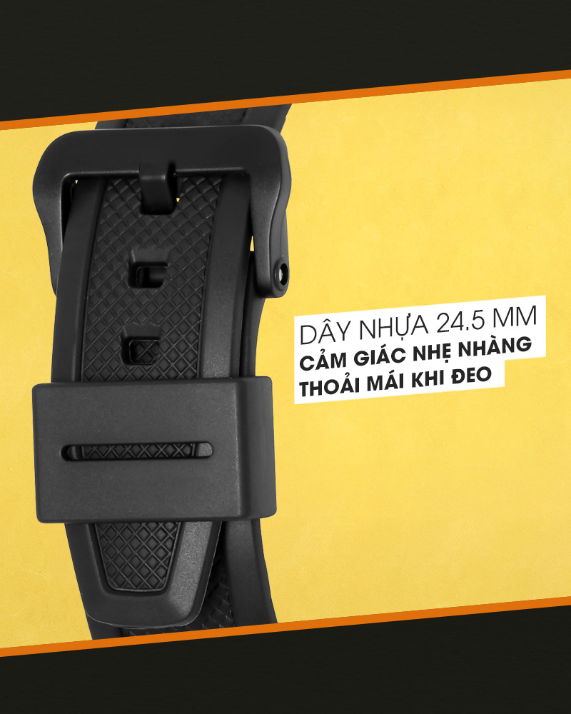 - Chiếc đồng hồ nam này sở hữu khung viền nhựa Resin bền chắc và dây đeo nhựa không thấm nước, trọng lượng nhẹ