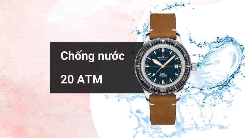 - Chiếc đồng hồ được trang bị hệ số chống nước lên đến 20 ATM, cho bạn thoải mái đeo khi đi lặn và đi bơi