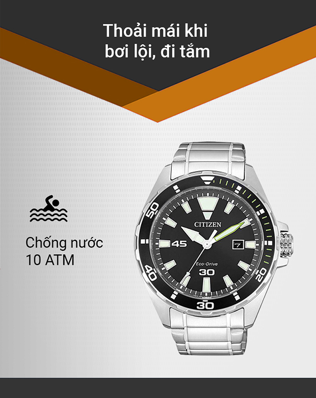 Hệ số chống nước 10 ATM, giúp bạn thoải mái khi bơi lội, tắm, rửa tay và đi mưa, không đeo đồng hồ Citizen khi đi lặn.