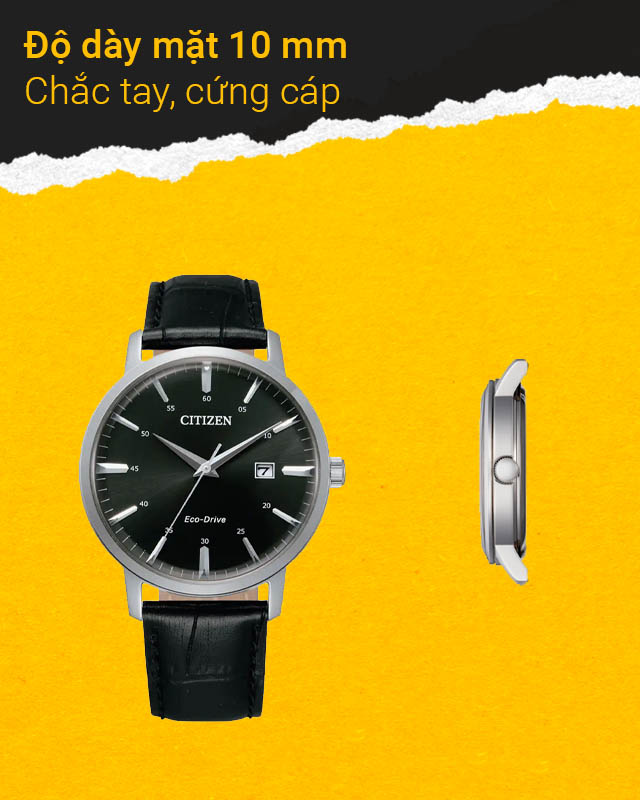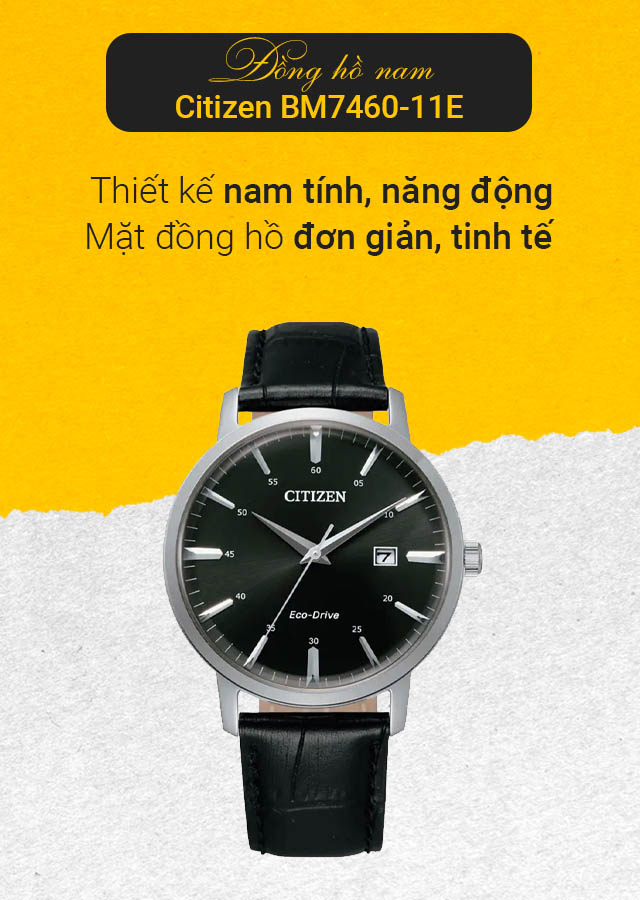 Tổng quan về đồng hồ Nam Citizen BM7460-11EĐồng hồ Nam Citizen BM7460-11E hoạt động bền bỉ với công nghệ Eco-DriveĐồng hồ Nam Citizen BM7460-11E có khung viền thép không gỉĐồng hồ Nam Citizen BM7460-11E có mặt kính khoáng cứng cápĐồng hồ Nam Citizen BM7460-11E có hệ số chống nước 5 ATMĐồng hồ Nam Citizen BM7460-11E chắc tay với độ dày mặt 10 mmĐồng hồ Nam Citizen BM7460-11E có dây đeo da êm áiĐồng hồ Nam Citizen BM7460-11E có ô lịch ngày tiện lợi