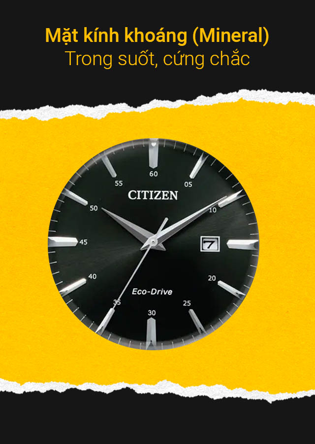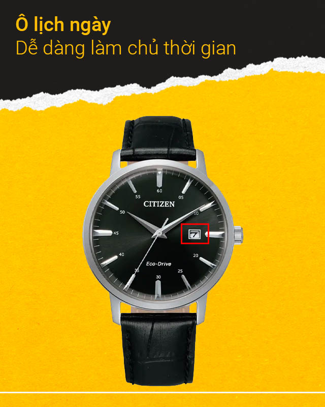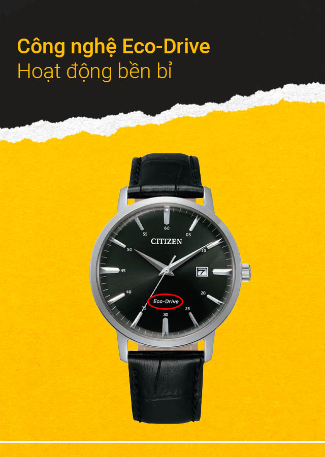 - Bộ máy Eco-Drive đặc trưng của hãng Citizen với thiết kế siêu mỏng và khả năng hấp thụ ánh sáng từ đèn cầy, đèn huỳnh quang, mặt trời,... để sạc pin