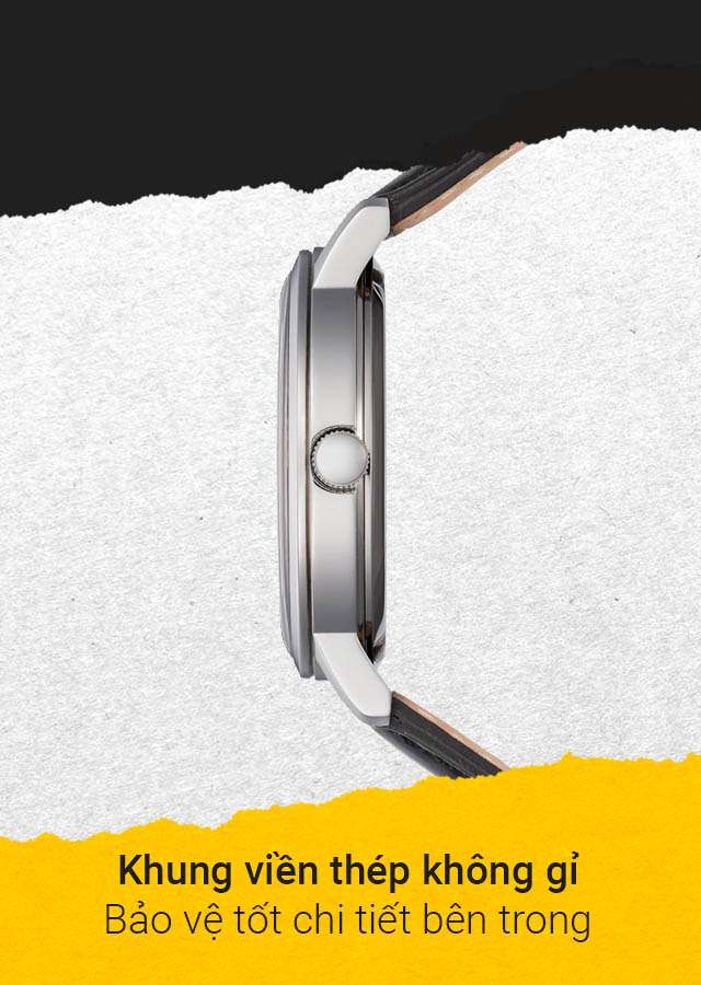 - Mẫu đồng hồ nam được trang bị khung viền làm từ thép không gỉ có độ cứng cao, chống oxy hóa tốt và dây đeo bằng da cho cảm giác mềm mại, vừa vặn với cổ tay