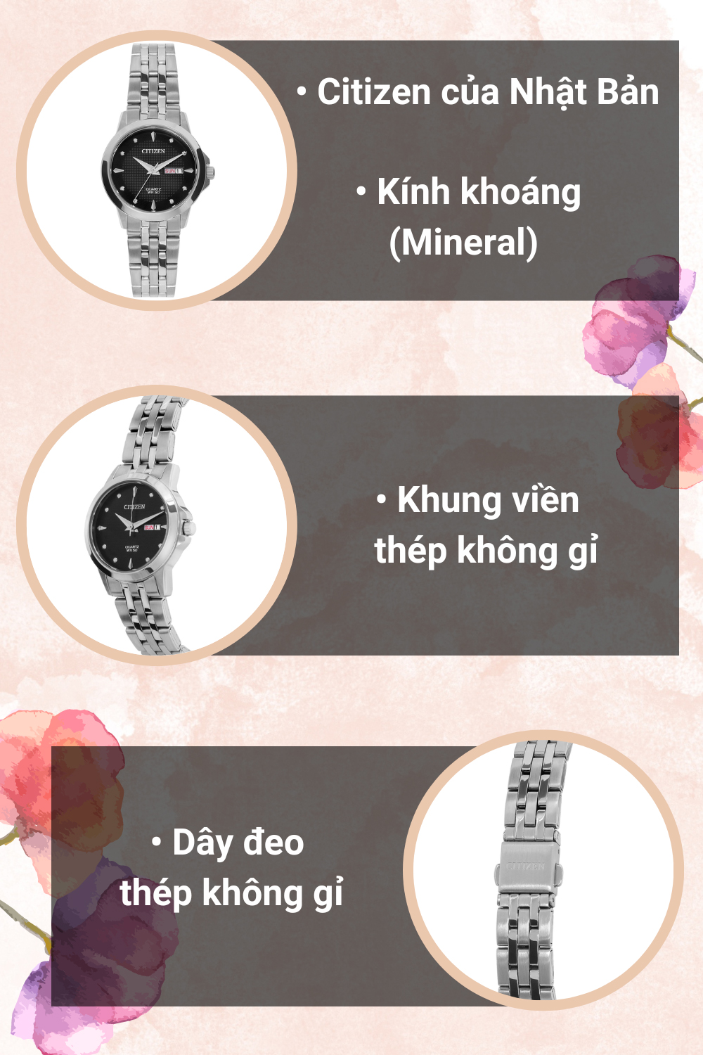 - Với thiết kế thời trang, sang trọng, chi tiết máy hoàn hảo, độ chính xác cao, đồng hồ Citizen luôn đi đầu trong các đột phá về công nghệ và giá cả.
