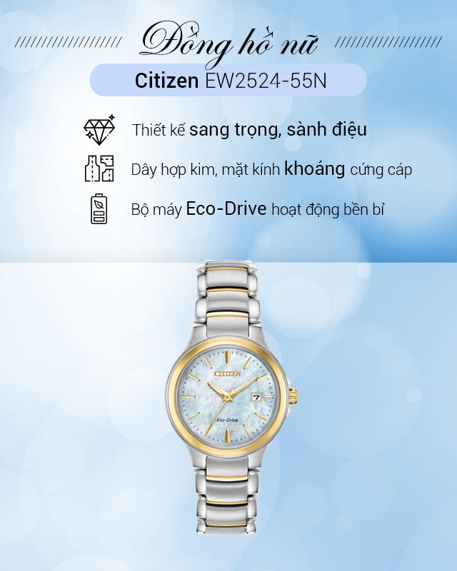 Thuộc hãng đồng hồ Citizen của Nhật Bản, đồng hồ nữ Citizen EW2524-55N là sự lựa chọn đáng tin cậy dành cho bạn.
