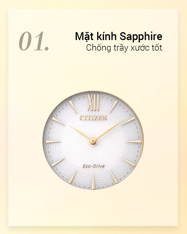 - Mặt kính đồng hồ Citizen trong suốt, cứng cáp, có thể đánh bóng, làm mới lại sau khi đeo một thời gian.