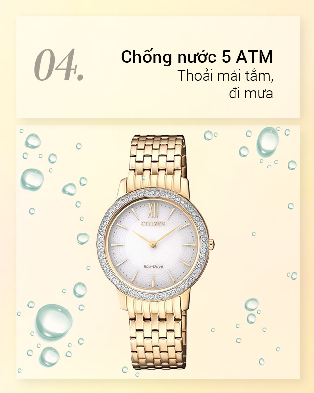 Khả năng chống nước 5 ATM giúp bạn an tâm khi tắm và rửa tay, không đeo đồng hồ khi tham gia các môn thể thao dưới nước như lặn, bơi, lướt ván,...