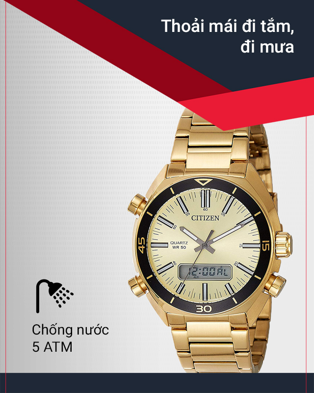 Hệ số chống nước 5 ATM cho phép bạn đeo chiếc đồng hồ quartz này đi mưa, rửa tay hay tắm, không mang khi bơi, lặn.