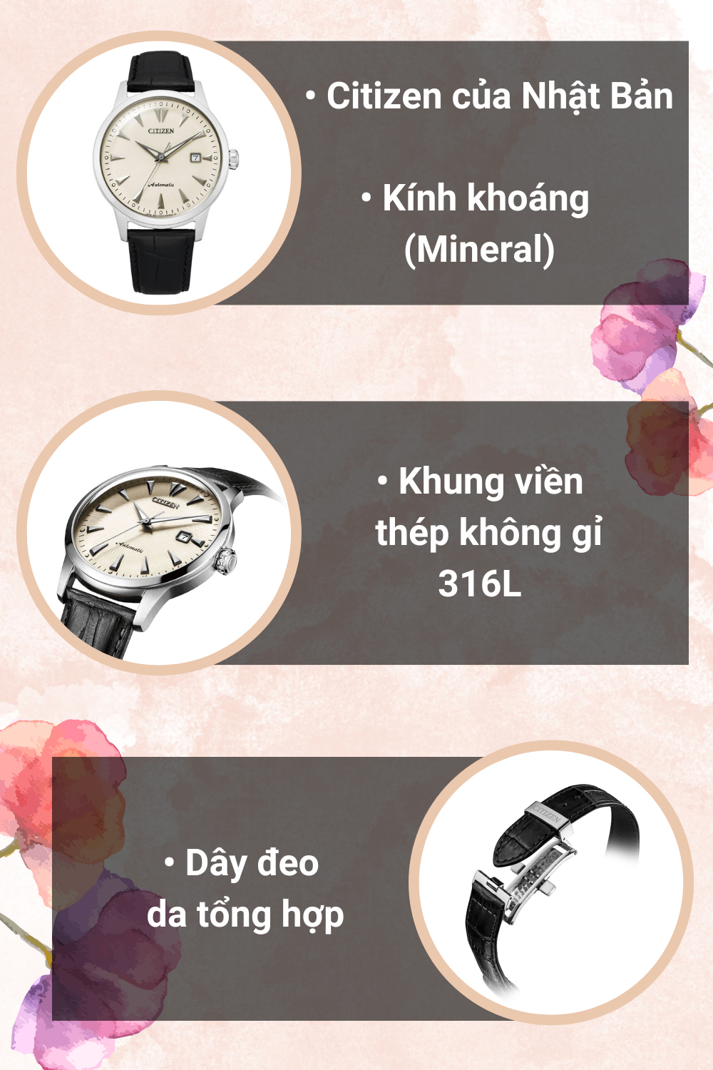 - Với thiết kế thời trang, sang trọng, chi tiết máy hoàn hảo, độ chính xác cao, đồng hồ Citizen luôn đi đầu trong các đột phá về công nghệ và giá cả.