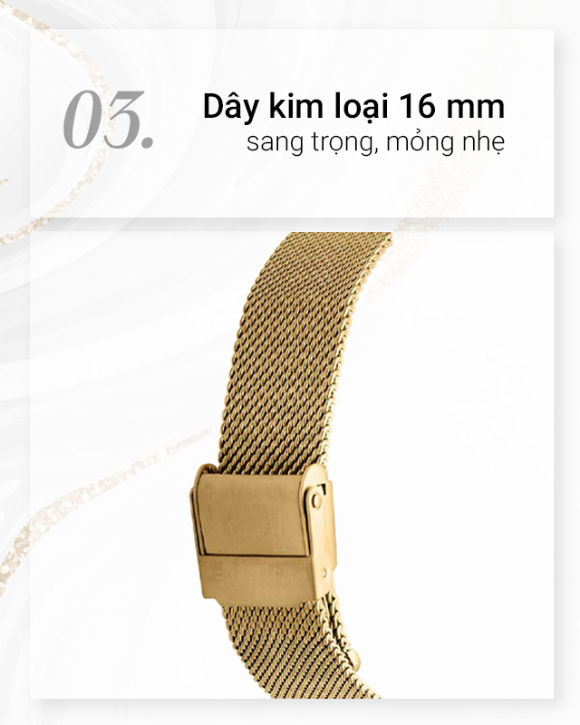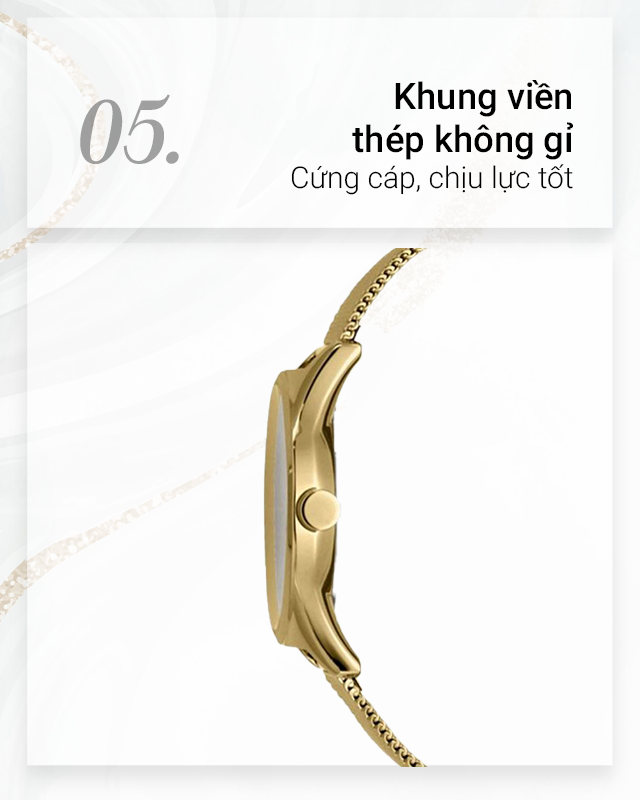 - Sở hữu khung viền thép không gỉ có độ cứng cao, chống trầy xước, chịu được lực tốt, bảo vệ sản phẩm an toàn. Dây đeo kim loại chống ăn mòn tốt, bảo vệ da tay phái nữ an toàn