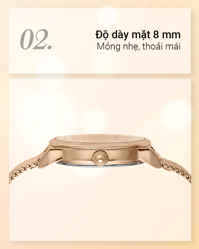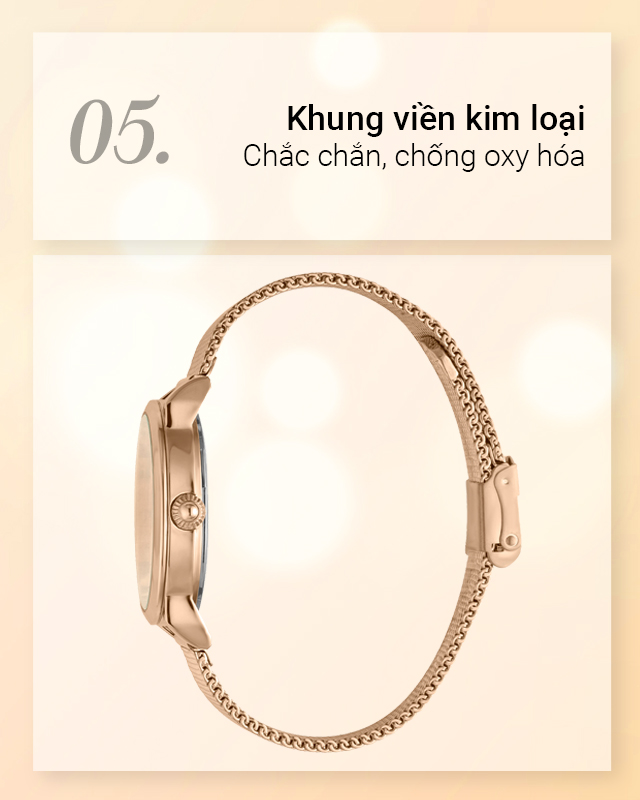 - Chiếc đồng hồ nữ có khả năng chịu lực tốt, hạn chế những vết trầy xước khi va đập nhờ khung viền và dây đeo được làm hoàn toàn bằng kim loại