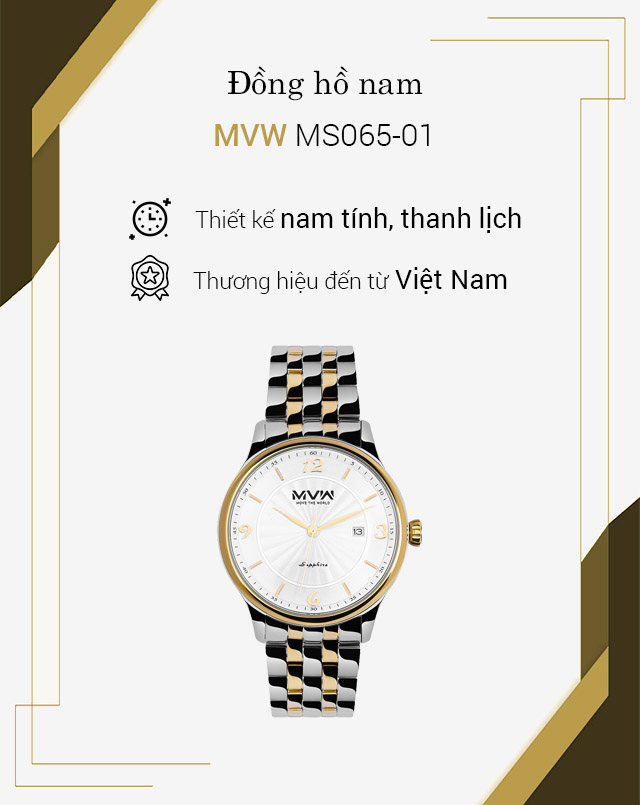 Tổng quan về đồng hồ nam MVW MS065-01 Đồng hồ nam MVW MS065-01 có mặt kính Sapphire cao cấpĐồng hồ nam MVW MS065-01 có khung viền chịu va đập tốtĐồng hồ nam MVW MS065-01 có dây đeo thép không gỉ bền bỉĐồng hồ nam MVW MS065-01 có thêm ô lịch ngày tiện lợiĐồng hồ nam MVW MS065-01 an toàn khi đeo đi tắm