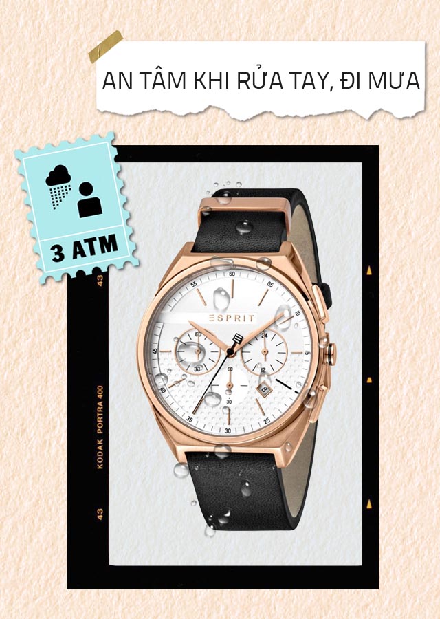- Người dùng có thể an tâm khi đi dưới mưa hay rửa tay nhờ vào khả năng chống nước 3 ATM của đồng hồ. Lưu ý, nên để đồng hồ nơi khô ráo khi tắm, bơi lội hoặc lặn
