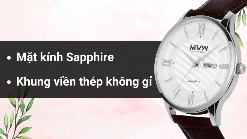 • Chất liệu mặt kính là kính Sapphire, độ bóng bắt mắt, chống trầy xước bền bỉ, có độ cứng và độ chịu lực cao cùng với khả năng chống ăn mòn tốt.
