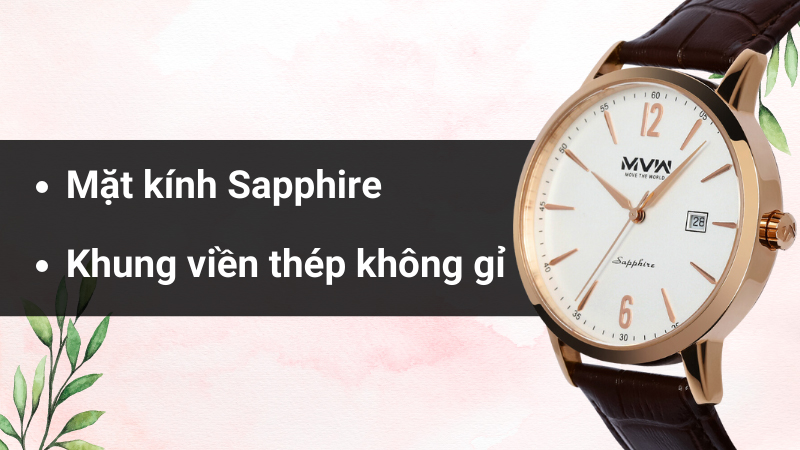 • Chất liệu mặt kính là kính Sapphire, độ bóng bắt mắt, chống trầy xước bền bỉ, có độ cứng và độ chịu lực cao cùng với khả năng chống ăn mòn tốt.