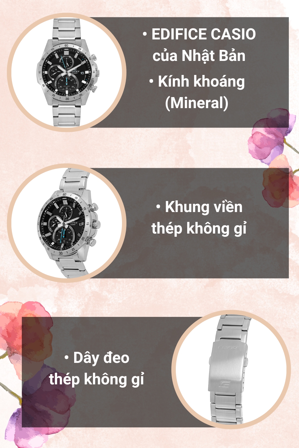 - Edifice Casio là một dòng của đồng hồ Casio, gây ấn tượng bởi thiết kế trẻ trung, hiện đại pha chút lịch lãm, cổ điển giúp đồng hồ trở nên sang trọng, được giới doanh nhân đặc biệt ưa chuộng.