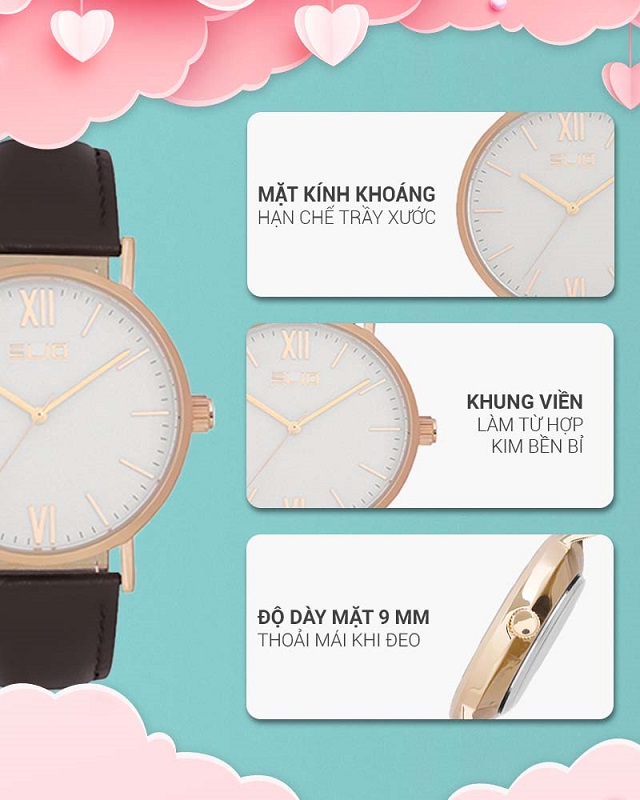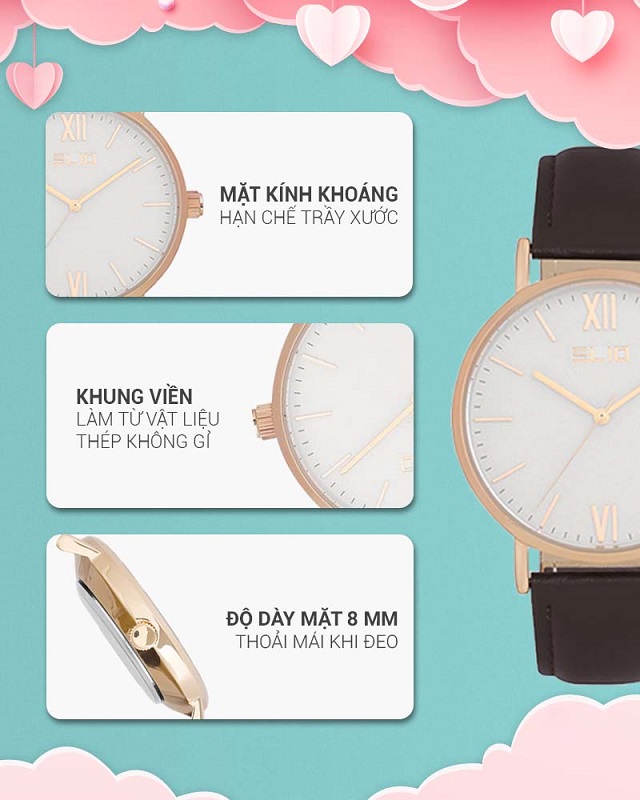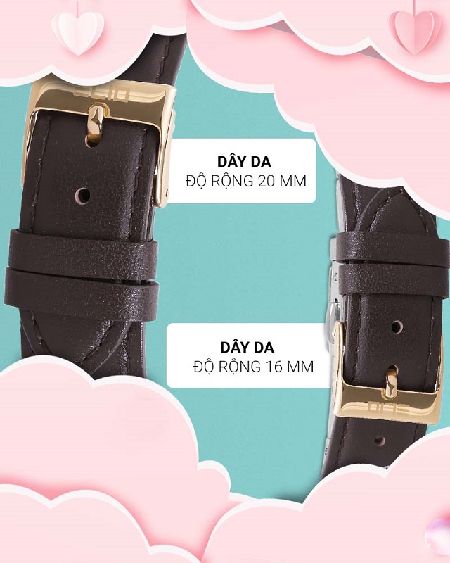 - Đồng hồ nữ có đường kính mặt 33 mm, độ rộng dây 16 mm, thích hợp với cổ tay có chu vi khoảng 13.5 - 17.5 cm