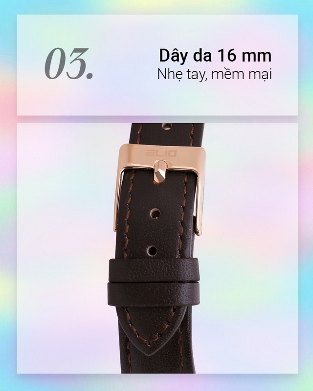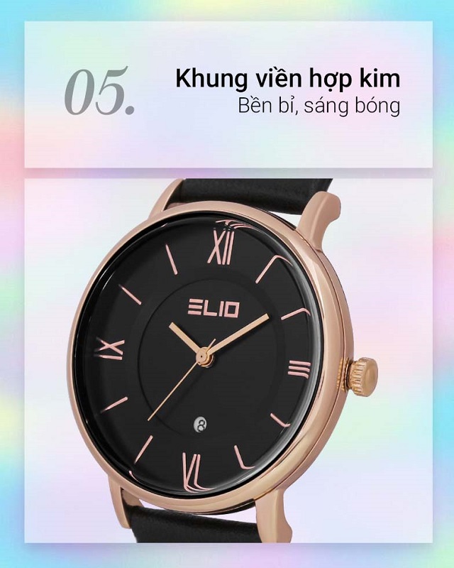 - Đồng hồ ELIO Nàng Thơ 33 mm Nữ EL053-02 có phần khung viền hợp kim bền chắc bảo vệ tốt các chi tiết bên trong. Dây da êm nhẹ, thoải mái đeo cả ngày dài