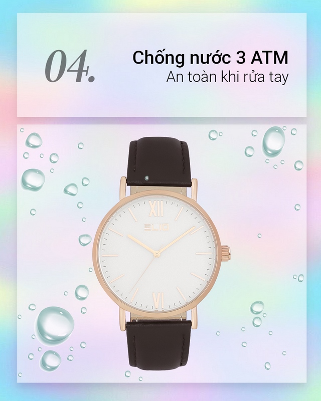 - Yên tâm đeo đồng hồ khi đi mưa, rửa tay với độ chống nước 3 ATM, không mang khi tắm hay bơi lội