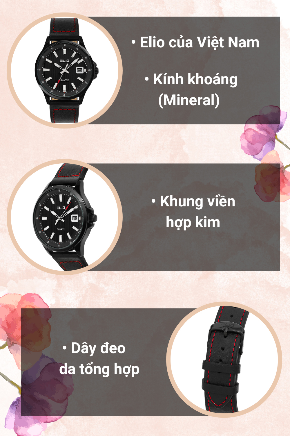 - Đồng hồ Elio với kiểu dáng, mẫu mã năng động, trẻ trung phù hợp với mọi lứa tuổi, đồng thời đồng hồ Elio còn mang vẻ đẹp sang trọng, lịch lãm. Đặc biệt đồng hồ Elio còn sử dụng bộ máy của Nhật Bản với chất lượng và độ bền cao.