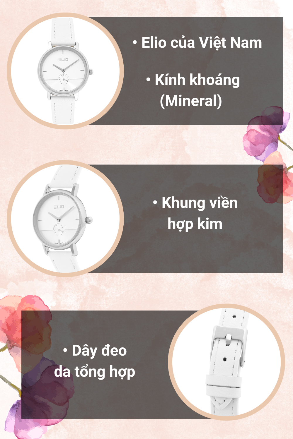 • Nổi bật với thiết kế đơn giản nhưng vô cùng tinh tế. Mẫu đồng hồ này đến từ thương hiệu đồng hồ Elio - thương hiệu độc quyền của Thế Giới Di Động, phù hợp với những cô nàng ưa thích sự tinh tế và năng động.