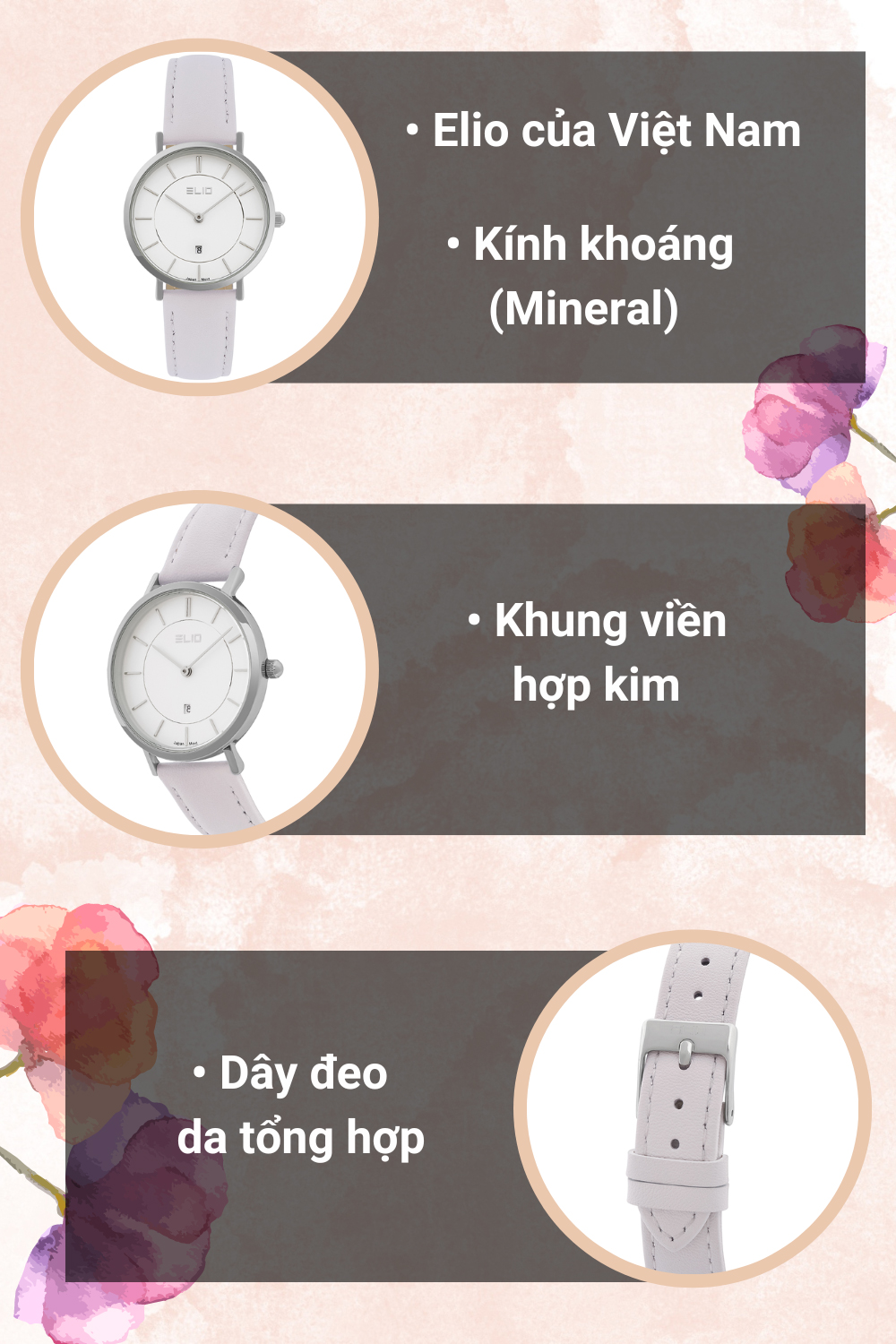 • Đồng hồ ELIO 33 mm Nữ EL100-01 với thiết kế tinh tế phù hợp cho các cô nàng ưa thích sự đơn giản nhưng vô cùng thanh lịch. Đây là một trong những mẫu đồng hồ đến từ thương hiệu đồng hồ Elio uy tín của Việt Nam, được kinh doanh độc quyền tại Thế Giới Di Động.