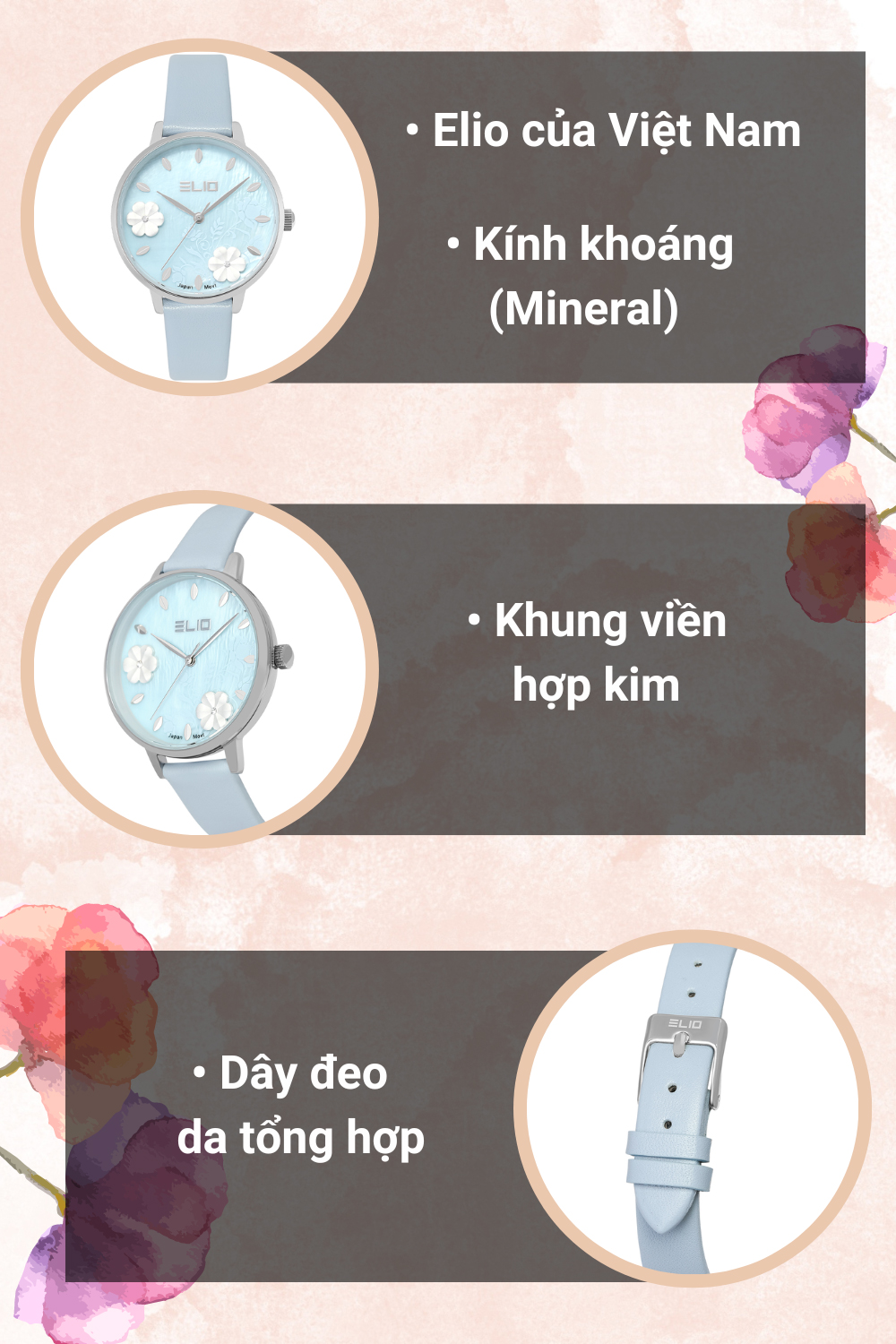• Khung viền được làm từ hợp kim sáng bóng, bền chắc, cứng cáp bảo vệ các chi tiết bên trong. Đồng hồ ELIO Flower 35 mm Nữ EL123-02 có chất liệu dây làm từ da tổng hợp khiến người dùng cảm giác thoải mái khi sử dụng đồng hồ này.