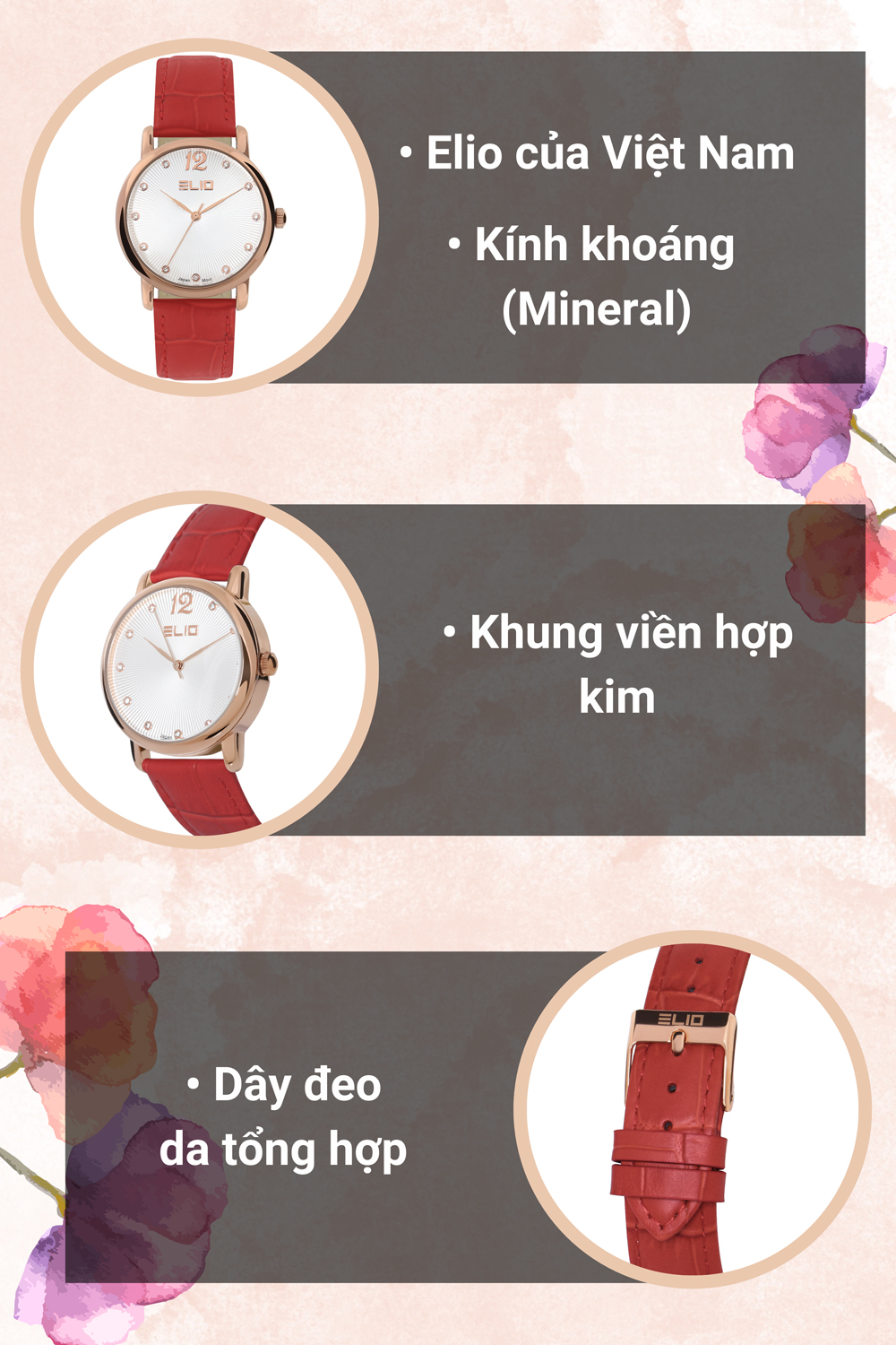 • Chiếc đồng hồ nữ Elio EL127-05 thuộc thương hiệu Elio đang được kinh doanh độc quyền tại Thế Giới Di Động ở Việt Nam mang đến một thiết kế đẹp mắt và thu hút, với cọc số được đính đá nhỏ gọn và tinh tế mang đến sự tích cực và lôi cuốn cho người đeo.