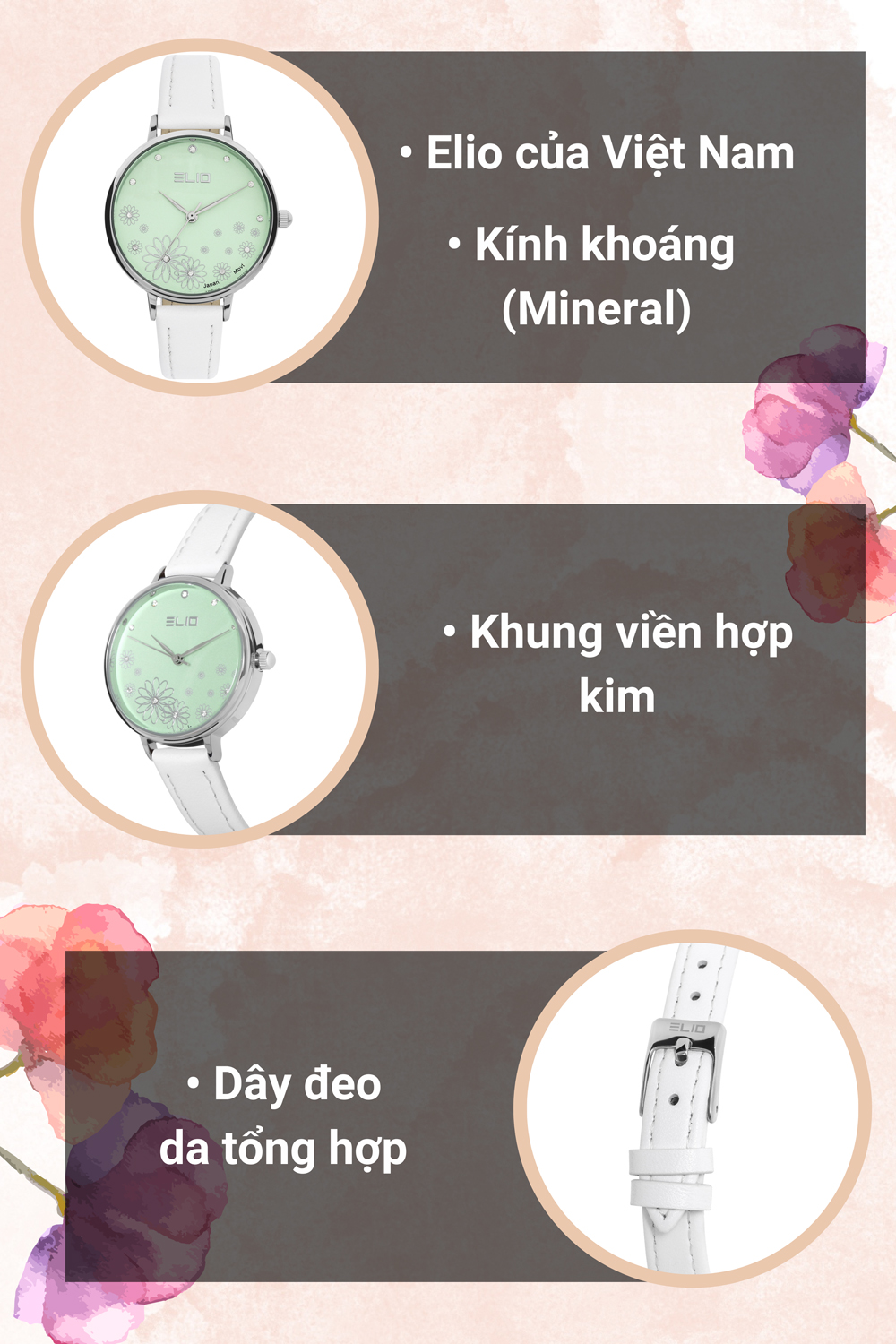 • Đồng hồ Elio Flower 32 mm Nữ EL128-02 thuộc thương hiệu Elio đến từ Việt Nam đã trở nên phổ biến trên thị trường nhờ thiết kế đẹp mắt, đặc biệt hấp dẫn đối với giới trẻ.
