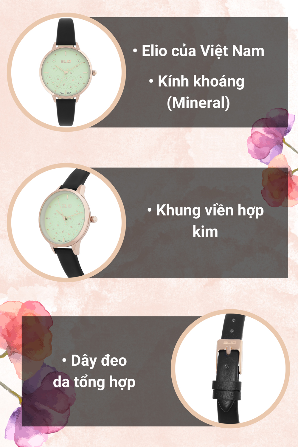 - Đồng hồ Elio với kiểu dáng, mẫu mã năng động, trẻ trung phù hợp với mọi lứa tuổi, đồng thời đồng hồ Elio còn mang vẻ đẹp sang trọng, lịch lãm. Đặc biệt đồng hồ Elio còn sử dụng bộ máy của Nhật Bản với chất lượng và độ bền cao.