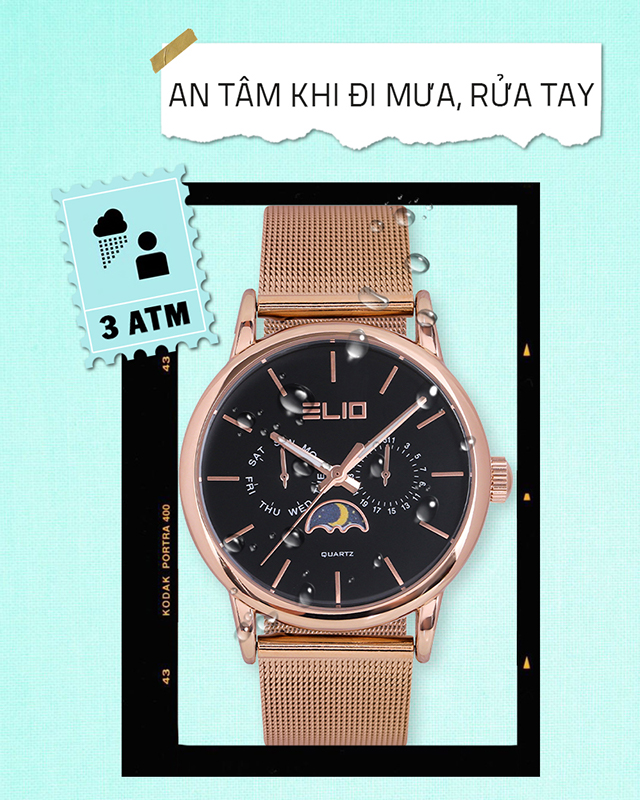 - Nhờ có hệ số chống nước 30m, người dùng thoải mái đeo đồng hồ nam khi đi mưa, rửa tay, không mang khi tắm, bơi, lặn
