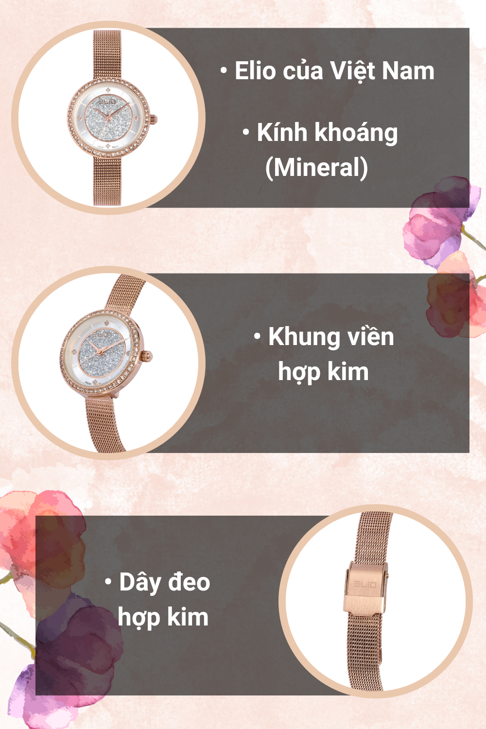 - Đồng hồ Elio với kiểu dáng, mẫu mã năng động, trẻ trung phù hợp với mọi lứa tuổi, đồng thời đồng hồ Elio còn mang vẻ đẹp sang trọng, lịch lãm. Đặc biệt đồng hồ Elio còn sử dụng bộ máy của Nhật Bản với chất lượng và độ bền cao.
