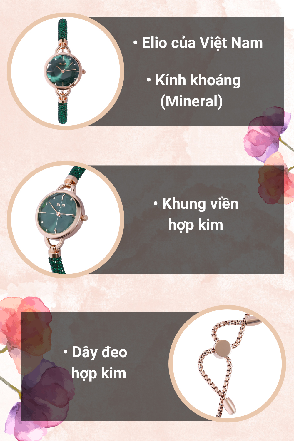 - Nổi bật với thiết kế tinh tế, độc đáo, sản phẩm đến từ hãng đồng hồ Elio, thương hiệu chất lượng của Việt Nam