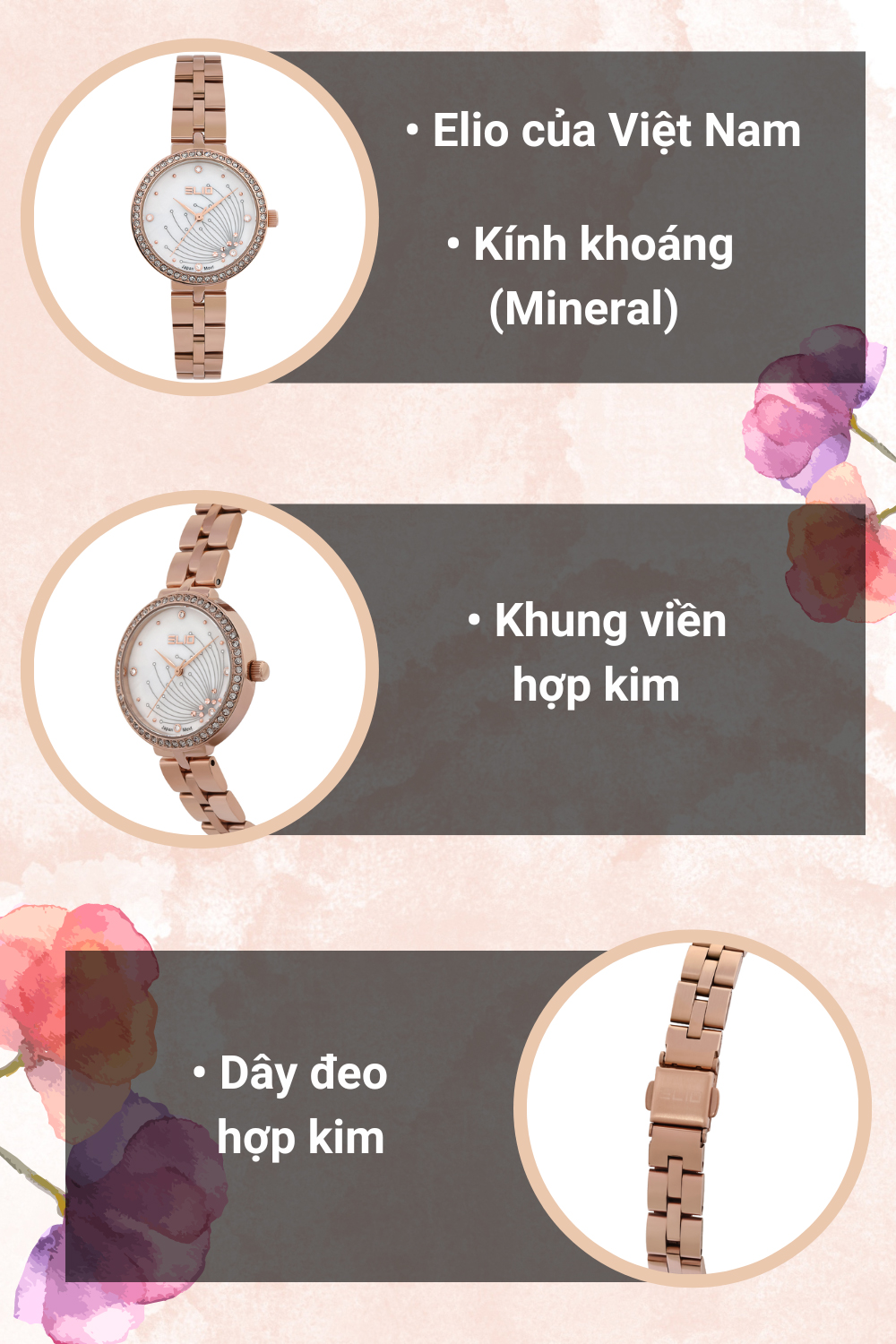 • Chiếc đồng hồ này mang đến thiết kế tinh tế cùng họa tiết mặt thu hút sẽ là lựa chọn phù hợp cho các cô nàng ưa thích sự trẻ trung. Đồng hồ ELIO Flower 32 mm Nữ ES119-03 đến từ thương hiệu đồng hồ Elio uy tín của Việt Nam, được kinh doanh độc quyền tại Thế Giới Di Động.