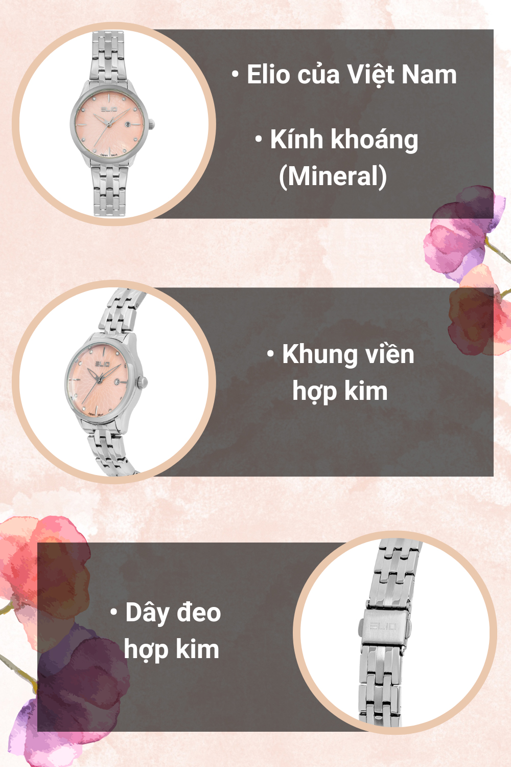 • Đồng hồ ELIO Flower 29.5 mm Nữ ES127-01 còn được tích hợp tiện ích lịch ngày ngay trên mặt đồng hồ giúp người dùng theo dõi thời gian một cách chủ động.
