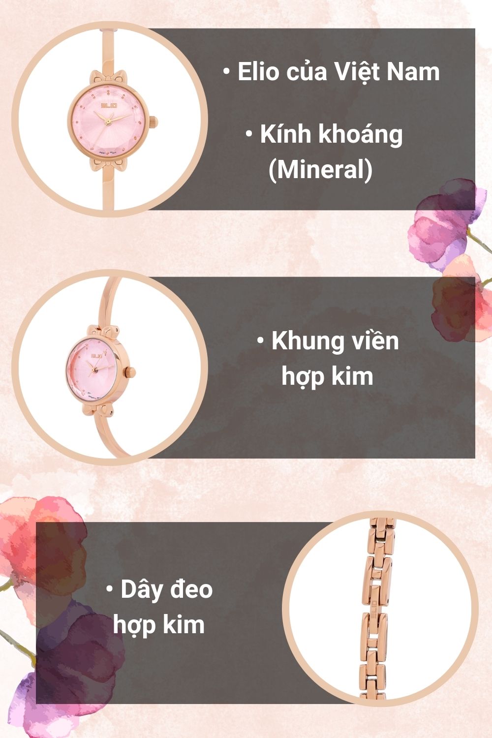 • Đồng hồ Elio 23 mm Nữ ES146-03 một sản phẩm thu hút đến từ thương hiệu Elio của Việt Nam, có kiểu dáng dáng thanh lịch và sang trọng với các chi tiết nhỏ xinh trên nền đồng hồ sáng màu, tạo nên một thiết kế ấn tượng, nổi bật.