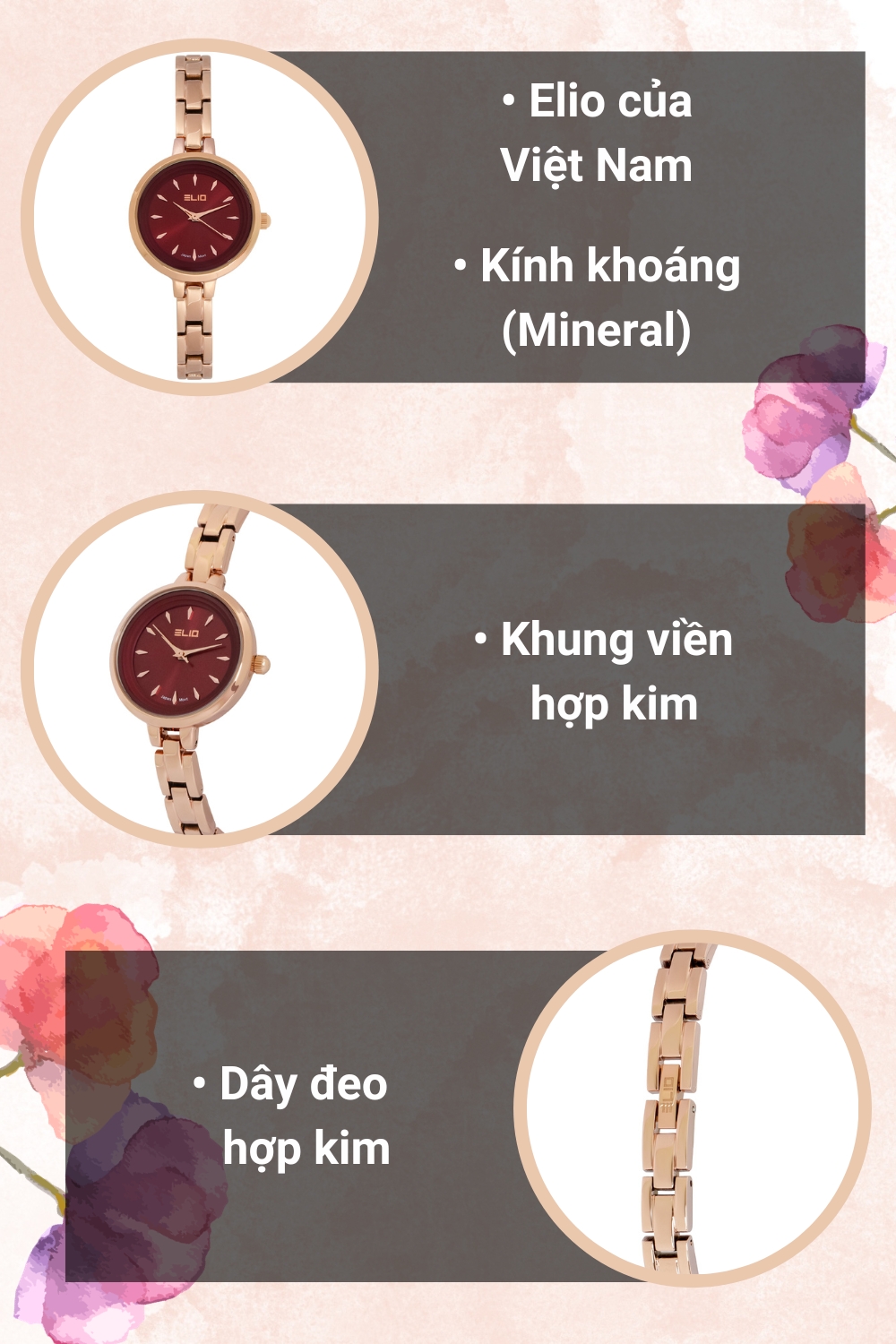 • Đồng hồ Elio 28 mm Nữ ES152-02 khoác lên mình một kiểu dáng đơn giản nhưng không kém phần tinh tế sang trọng, đi cùng với đó là chất liệu bền bỉ, cứng cáp thích hợp sử dụng hằng ngày, giúp bạn toát lên được sự thanh lịch và thu hút trong phong cách.