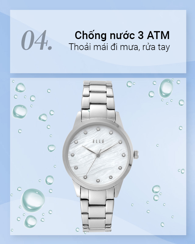 - Đồng hồ nữ có hệ số chống nước là 3 ATM nên có thể an tâm mang theo khi rửa tay, đi mưa nhỏ nhưng không nên đeo khi đi tắm hoặc bơi, lặn