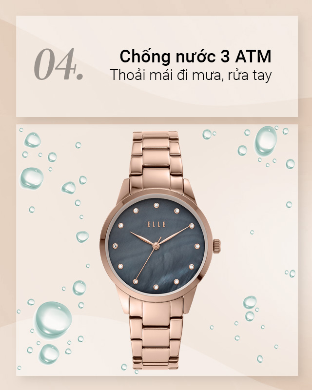 - Hệ số chống nước của đồng hồ nữ là 3 ATM nên người đeo có thể yên tâm sử dụng khi đi mưa nhỏ hoặc rửa tay nhưng không nên đeo khi tắm, tham gia bơi lội