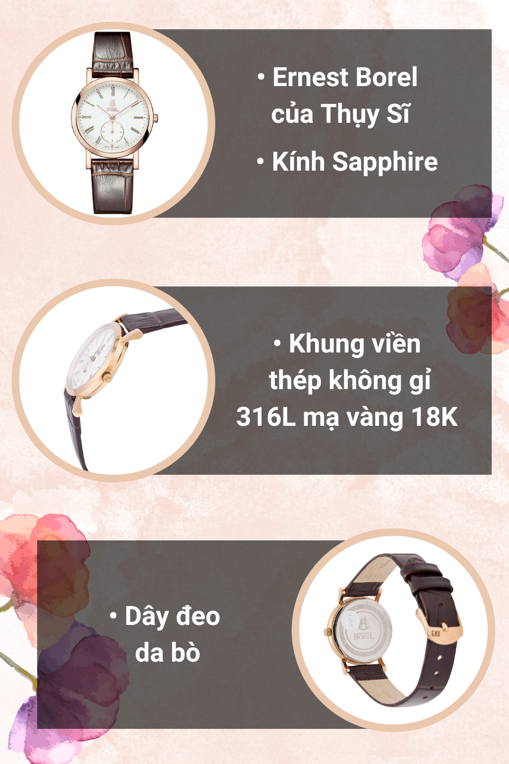 - Ernest Borel được biết tới là thương hiệu đồng hồ dành riêng cho các cặp đôi. Với thiết kế lãng mạn và tinh xảo, những chiếc đồng hồ Ernest Borel chắc hẳn sẽ rất phù hợp để làm món quà tình yêu dành tặng cho nửa kia của mình.